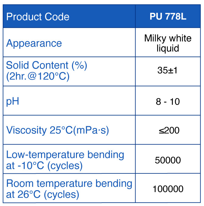 PU‑778L can be used for roll‑coating or spray‑coating processes and works well with a range of anionic auxiliaries, giving formulators the flexibility to fine‑tune formulations for specific production needs.