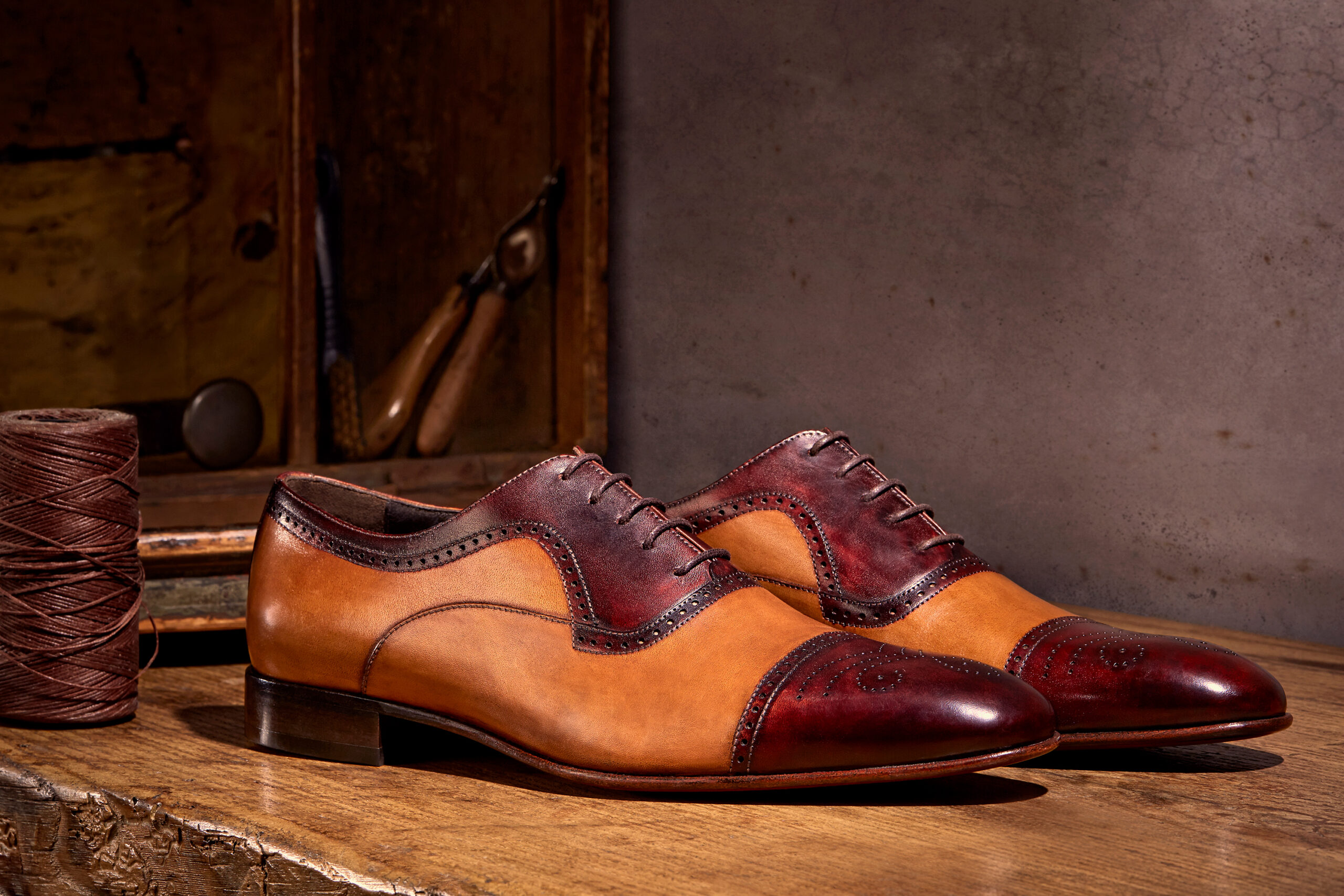 在上色后的皮鞋鞋头和后跟用烧焦蜡抛磨令颜色更加深润。