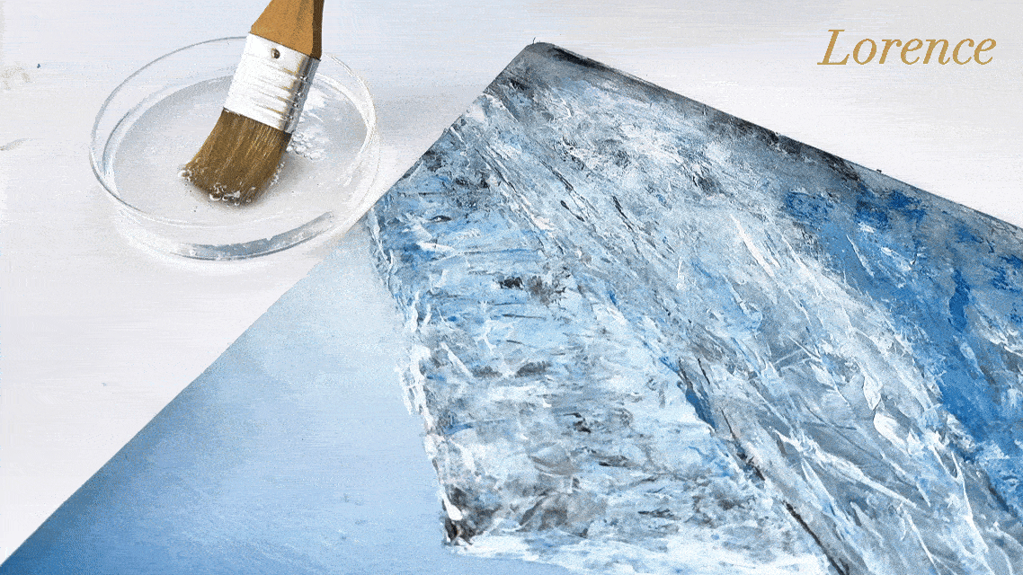 局部點綴刮刀創作賦予畫面強烈的觸感肌理,仿佛雪山觸手可及;黑色 TP 顏料膏增強明暗對比,突出山巒的深邃與意境;